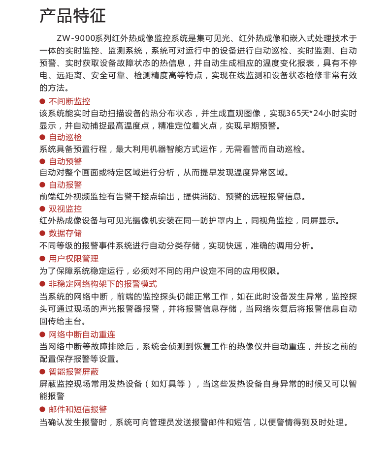 高精度多角度的紅外熱成像畫面判斷碳刷系統(tǒng)的運行狀況及周邊風(fēng)溫,并實現(xiàn)報警功能;使用超大規(guī)模組網(wǎng)技術(shù),將電廠所有紅外探測器并網(wǎng)到一個系統(tǒng)內(nèi);超前預(yù)警,對可能發(fā)生的故障信息做出超前預(yù)警;前置紅外探測器能脫離后臺獨立工作報警;內(nèi)置溫度閥值與溫升速率雙重智能報警分析算法;可預(yù)置工作狀態(tài),生成歷史溫度曲線,將工作狀態(tài)與溫度曲線重疊分析,得到不同工作狀態(tài)下的溫度特性;定時定點對設(shè)備的工作狀態(tài)做出診斷,并生成診斷報告;構(gòu)建數(shù)字化、標(biāo)準(zhǔn)化、智能化的熱成像大數(shù)據(jù)平臺,提供檢測任務(wù)數(shù)據(jù)統(tǒng)計、工作報表展示、數(shù)據(jù)查詢、圖像分析、歷史趨勢分析等豐富的數(shù)據(jù)管理;熱成像技術(shù)智能化與互聯(lián)網(wǎng)化的深度融合,實現(xiàn)本地數(shù)據(jù)與云端數(shù)據(jù)的同步與共享,打破空間壁壘,實現(xiàn)巡檢任務(wù)跨地域管理;預(yù)置工作狀態(tài),生成歷史溫度曲線,將工作狀態(tài)與溫度曲線重疊分析,得到不同工作狀態(tài)下的溫度特性。