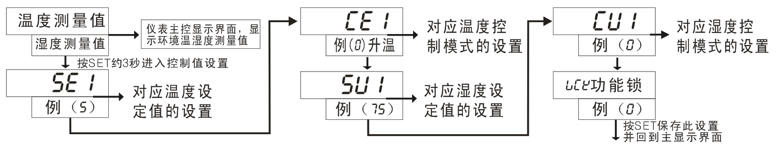 4、濕度控制模式“CU1”:可設(shè)置濕度啟控模式: 目前出廠設(shè)置默認為除濕型。(如需加濕型啟控模式為特殊定貨,下單時特別說明)。